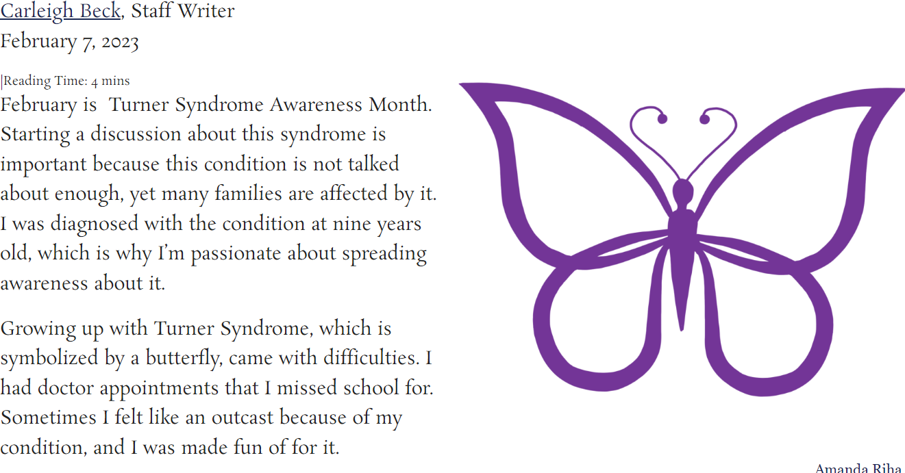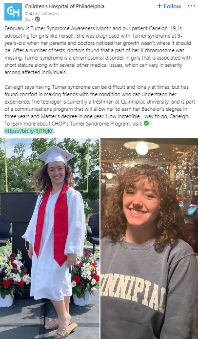 TSF volunteer Carleigh Beck, a journalism and media studies major at Quinnipiac University in Connecticut, published an article about TS in the Quinnipiac Chronicle. Carleigh has reported that she’s seen the impact of this article on campus, with staff and other students asking more questions about TS and gaining knowledge about the condition. She was also recognized for all of her achievements in a Linkedin post by the Children’s Hospital of Philadelphia (CHoP), where she was a patient.
