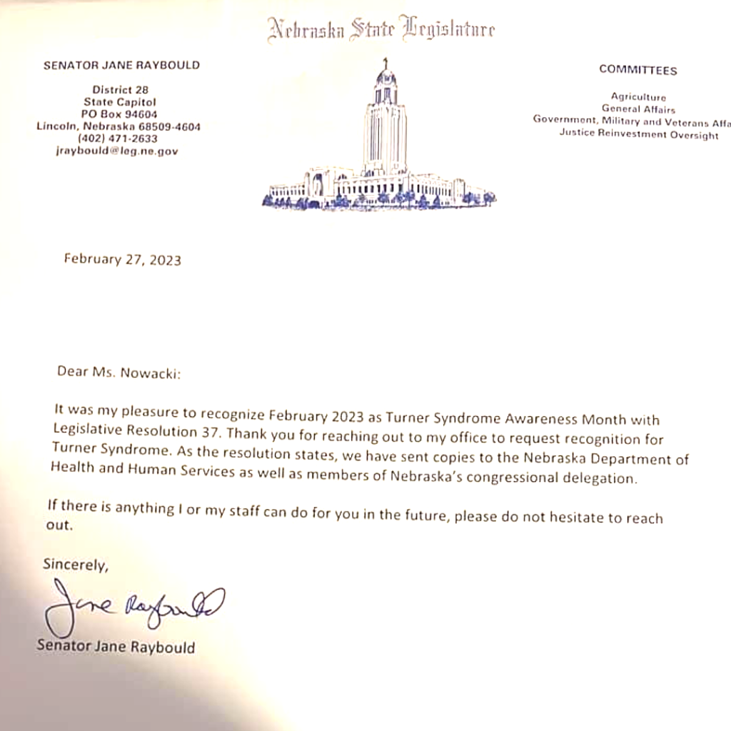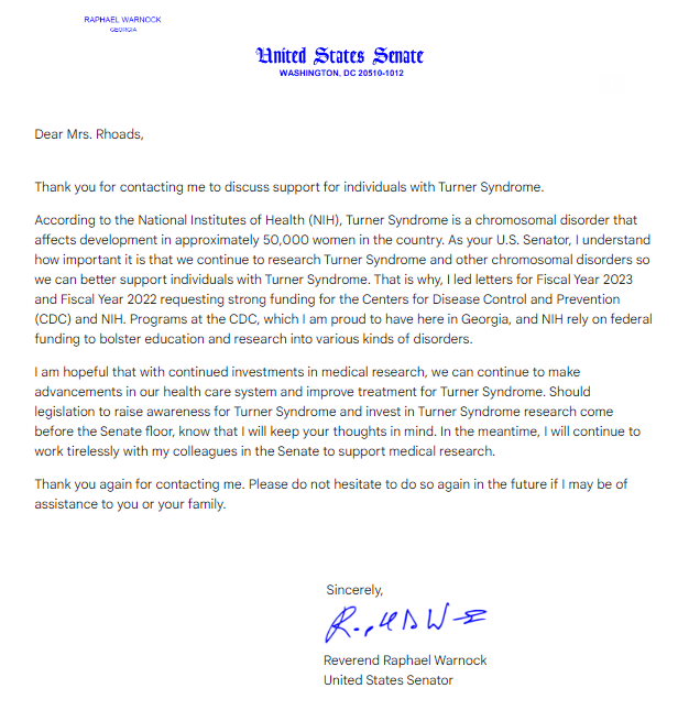 TSF awareness and blog volunteer Helen Rhoads contacted her U.S. senator, Rev. Raphael Warnock, regarding TS awareness. He responded with a very supportive letter, stating, in part, “I am hopeful that with continued investments in medical research, we can continue to make advancements in our health care system and improve treatment for Turner syndrome. Should legislation to raise awareness for Turner syndrome and invest in Turner syndrome research come before the Senate floor, know that I will keep your thoughts in mind.”