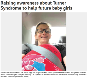"Most people are familiar with Down syndrome and cystic fibrosis but have never heard of Turner syndrome ... I am surprised about the lack of awareness ... I would like to [spark] more awareness that the condition even exists, as well as help get undiagnosed young girls diagnosed."