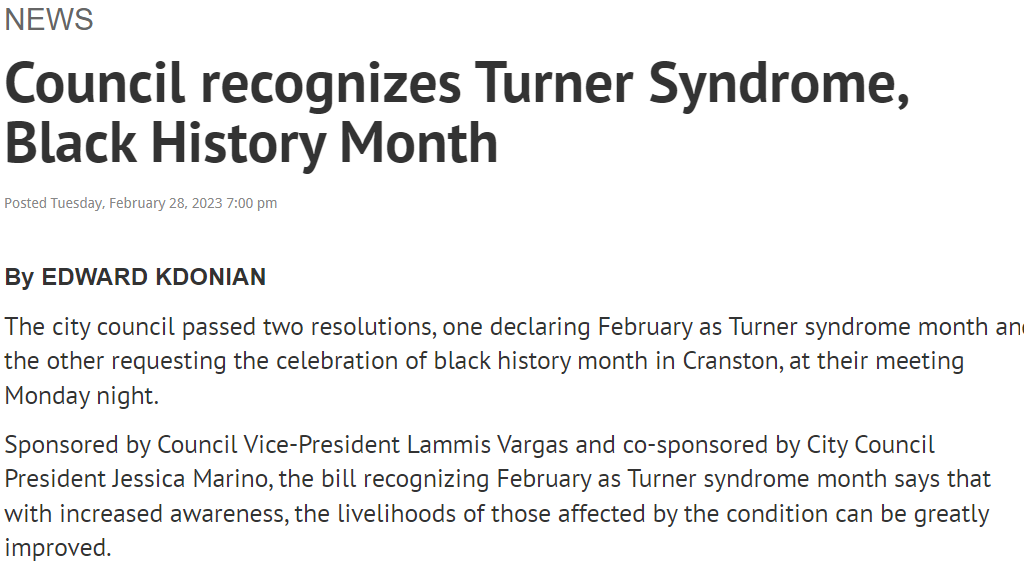 Nicole Topp also had the opportunity to have a huge advocacy impact this month when she spoke before her local city council in Cranston, RI! Due in large part to Nicole’s efforts, February was officially recognized as Turner Syndrome Awareness Month in Cranston!
