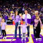 (center) Coach Mulkey’s daughter Makenzie Fuller, granddaughter Sage, grandson Kannon, & son-in-law Clay. Photo by Kristen Young
